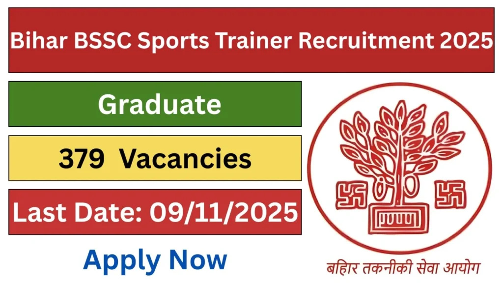 बिहार के युवाओं के लिए खुशखबरी! Bihar Staff Selection Commission (BSSC) ने राज्य में Sports Trainer (खेल प्रशिक्षक) पदों पर बड़ी भर्ती की घोषणा की है। BSSC Sports Trainer Recruitment 2025 के तहत कुल 379 पदों पर नियुक्तियां की जाएंगी। यह अवसर उन उम्मीदवारों के लिए खास है जो खेल जगत में करियर बनाना चाहते हैं और सरकारी सेवा के माध्यम से खिलाड़ियों को प्रशिक्षित करने का सपना देखते हैं।